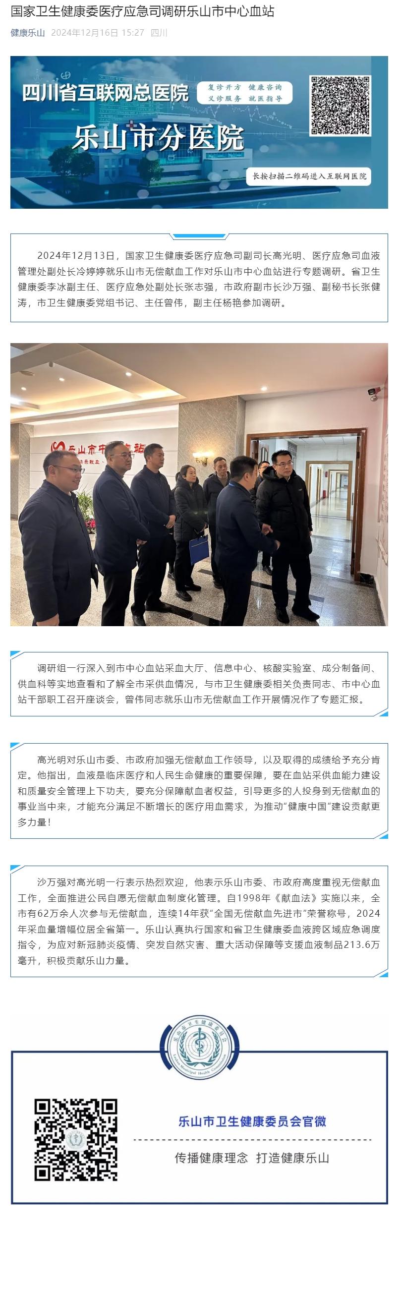 【转载】国家卫生健康委医疗应急司调研乐山市中心血站